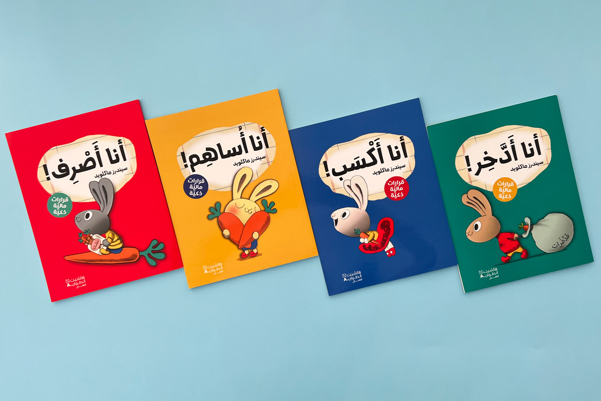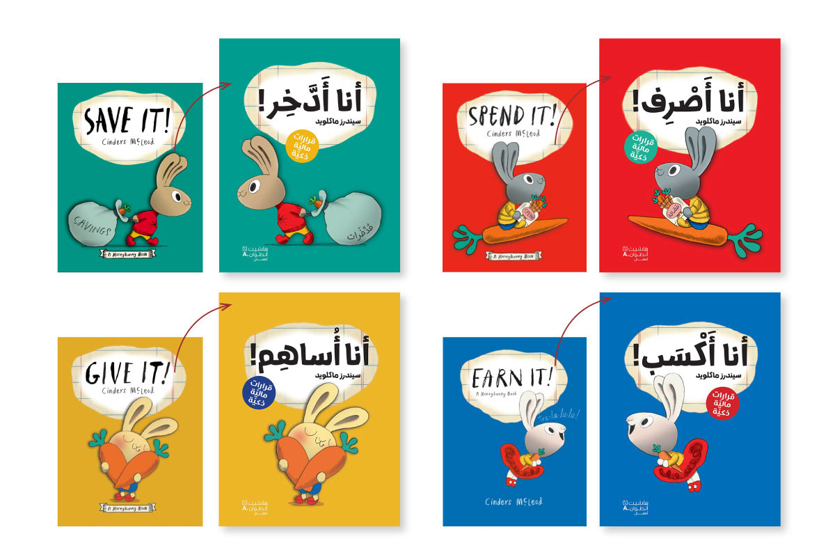 Adaptation of the Moneybunny series by Cinders McLeod into Arabic. Each cover was reconstructed to maintain the charm and clarity of the original illustrations while adjusting typography and spacing for Arabic letterforms. The visual tone remains playful and informative, supporting early financial awareness for young readers. Deliverables: Cover adaptation · Back cover layout · Typography adjustments