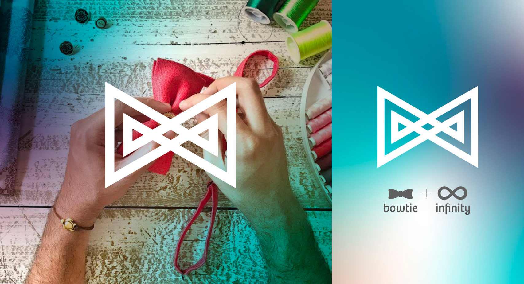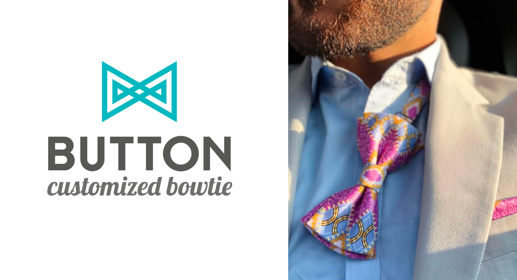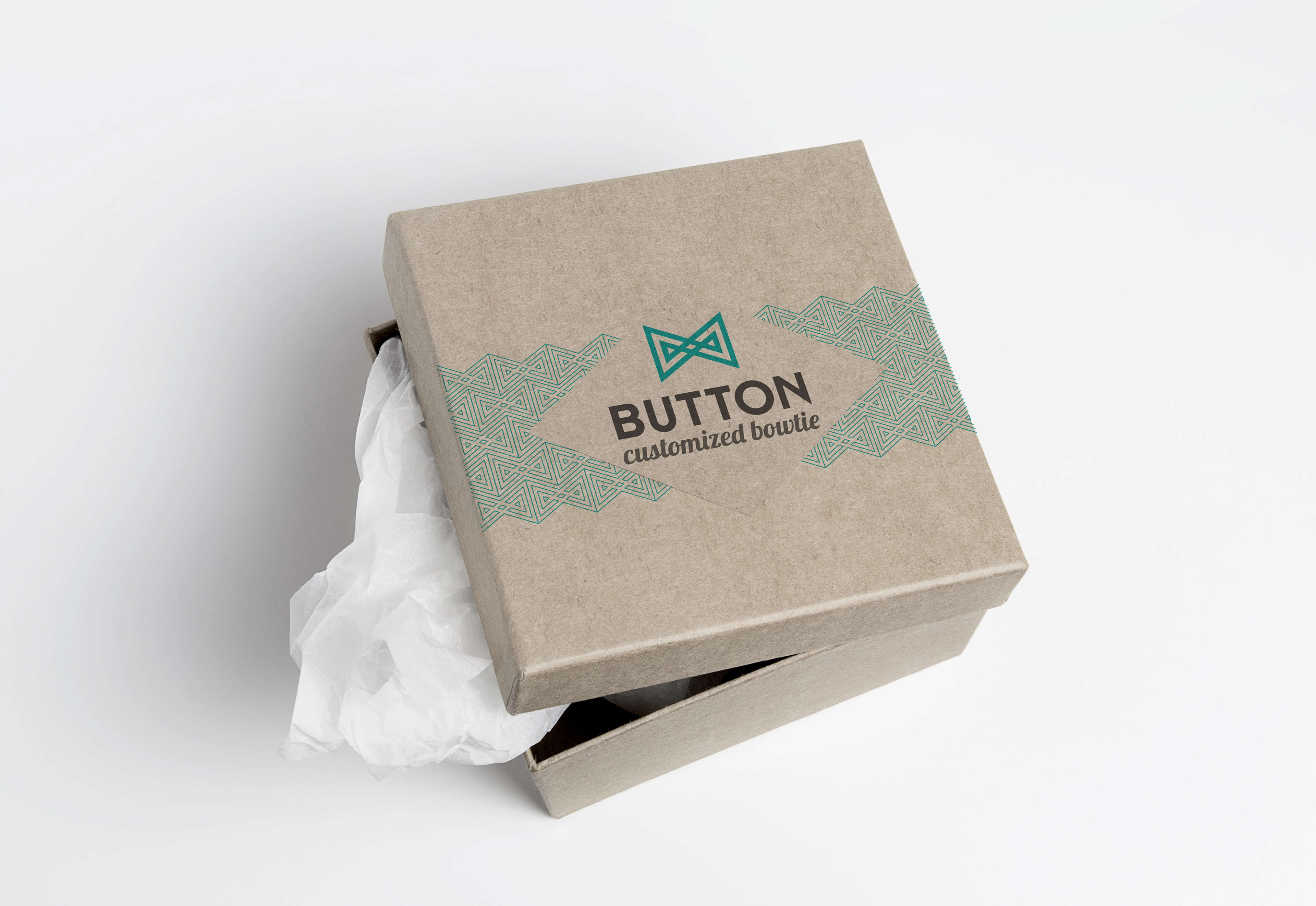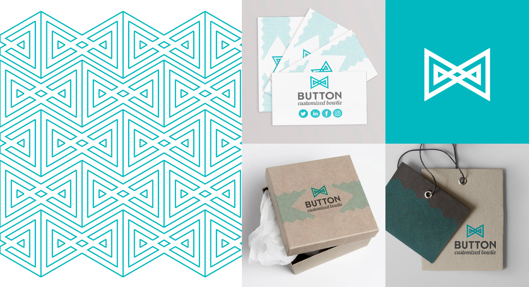 Brand identity design for Button, a contemporary label specializing in personalized bowties. The logo concept reinterprets the bowtie form through geometric symmetry and linear precision, expressing both sophistication and modern craft. The visual system combines a light turquoise palette with minimalist patterns inspired by textile weaving — reflecting elegance, individuality, and timeless fashion appeal. Deliverables included the logo, stationery, pattern design and packaging.