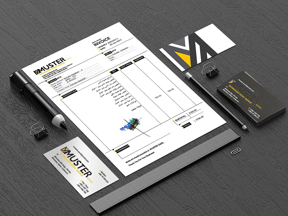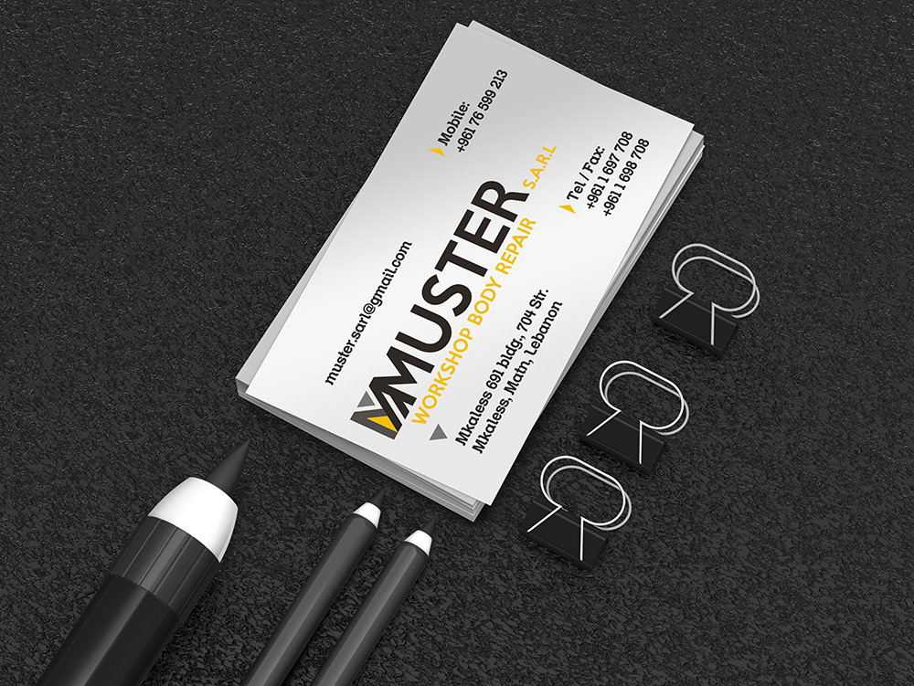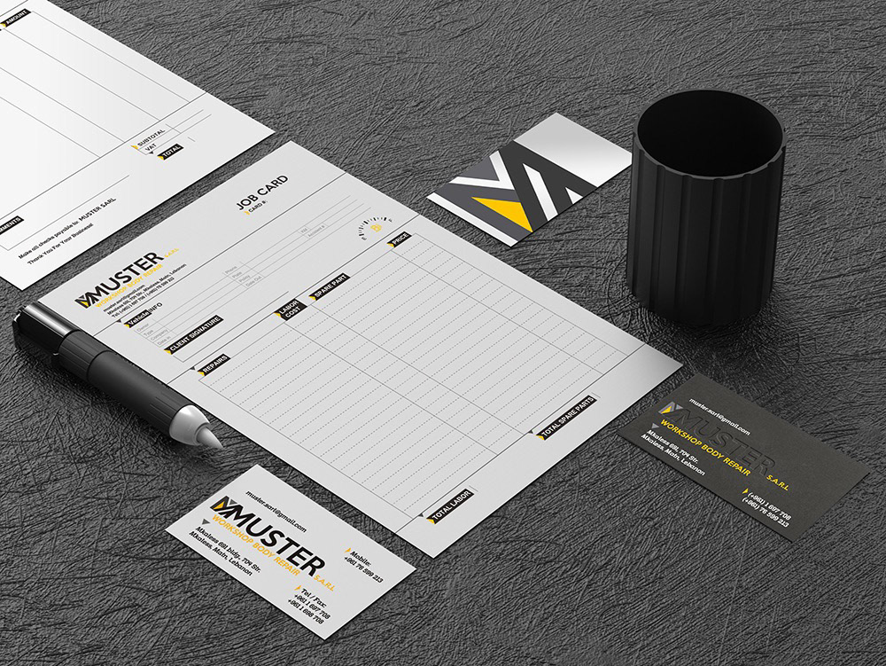 Freelance branding project for an automotive body repair workshop. I created the complete corporate identity — from logo design to stationery and promotional materials. The visual direction reflects precision and reliability through bold typography, clean geometric forms, and a black-and-yellow palette inspired by automotive safety and energy. Deliverables: logo, stationery system, business cards, job cards, and marketing visuals.