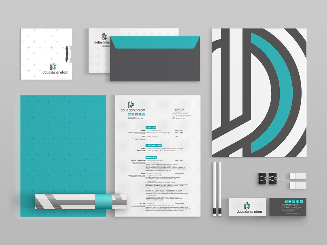 Personal identity design that reflects my professional philosophy and creative direction. The goal was to develop a modern, geometric, and timeless logo that captures the initials DDA in a fluid, interlocking form — symbolizing connection, precision, and balance between creativity and structure. The visual identity extends across stationery, business cards, and self-promotional materials, following a clean grid system with a monochrome and turquoise palette to express clarity, trust, and modernity. Every element — from typography to pattern design — reinforces a unified personal brand image consistent across print and digital platforms. Deliverables: logo design, stationery system, business cards, résumé layout, and brand pattern.